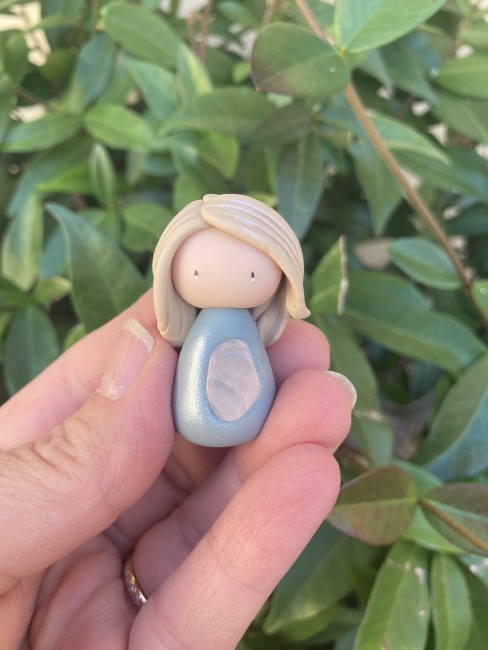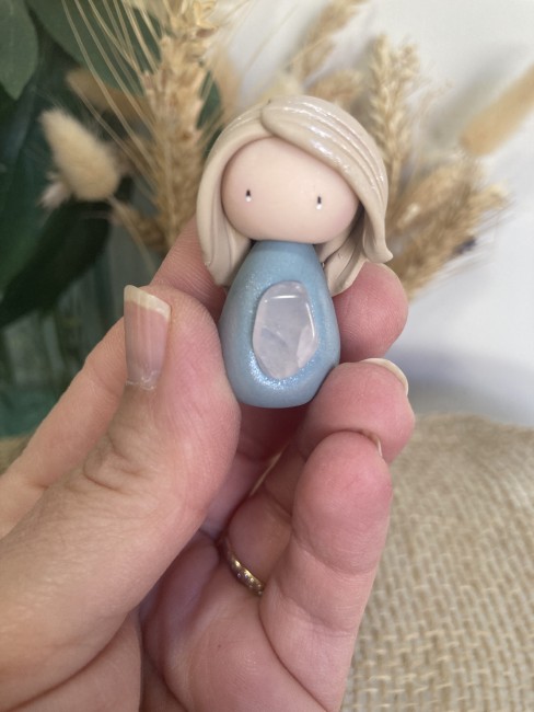 Petite poupée porte-bonheur modelée à la main pour Octobre Rose, avec un quartz rose.