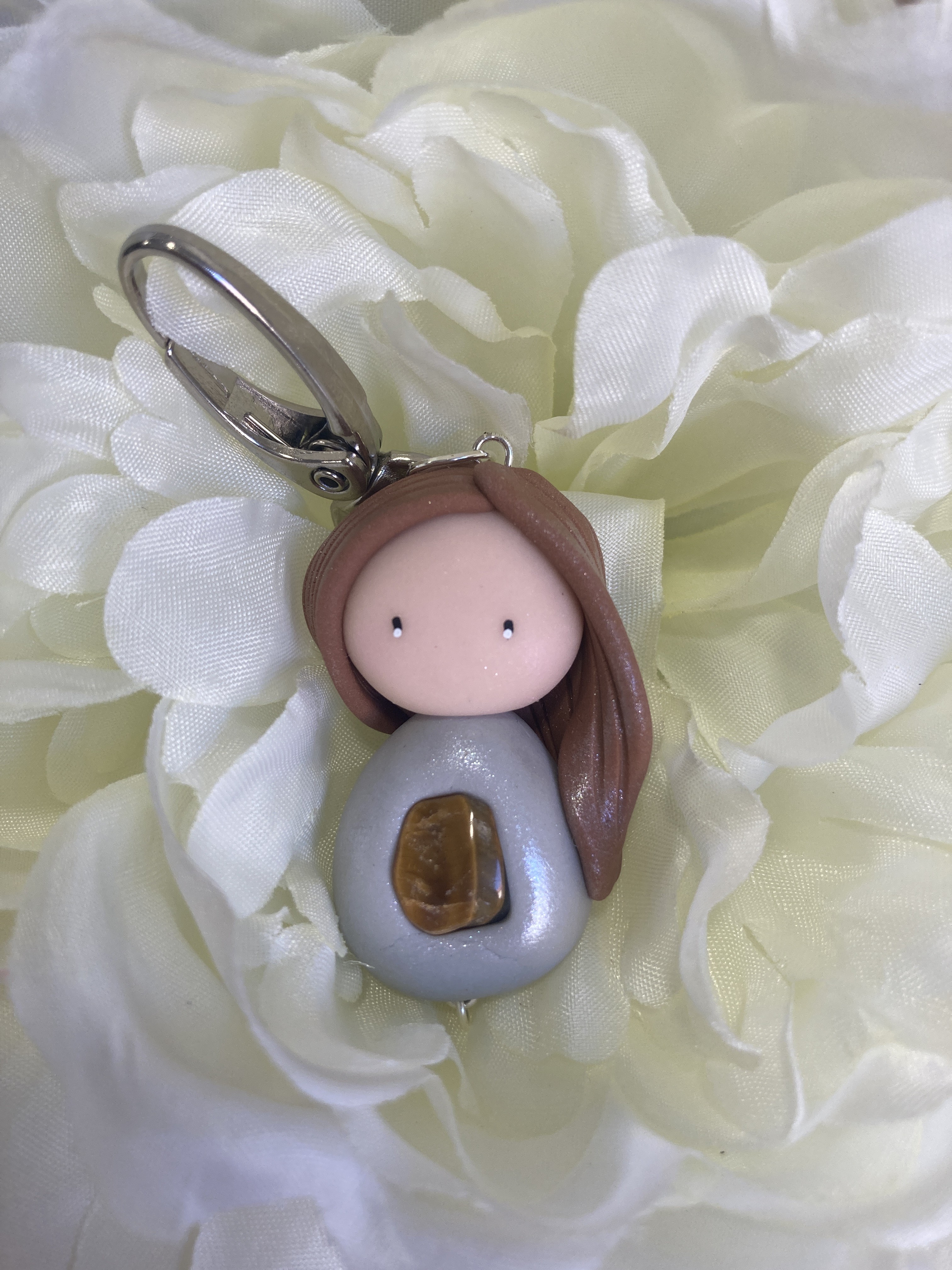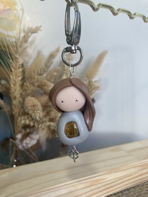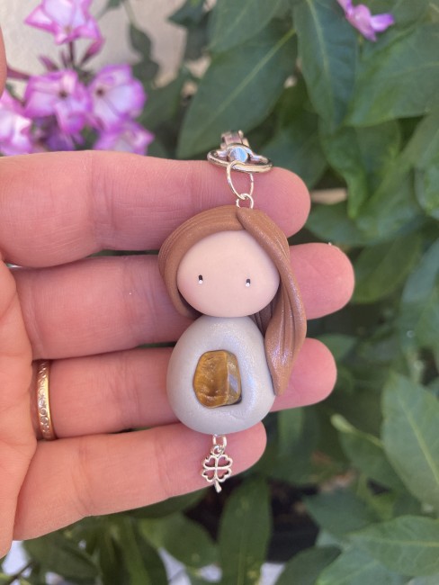 Petite poupée porte-bonheur modelée à la main pour Octobre Rose, avec un Oeil du Tigre.