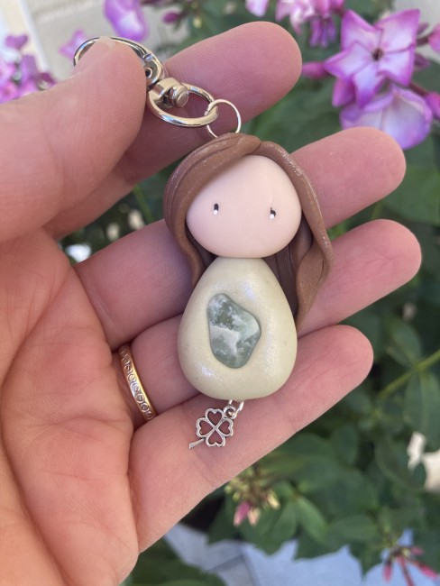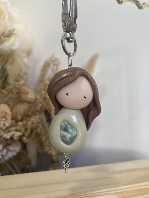 Petite poupée porte-bonheur modelée à la main pour Octobre Rose, avec une Aventurine Verte.