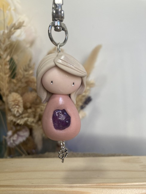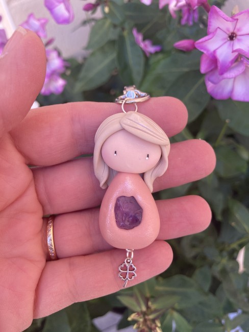 Petite poupée porte-bonheur modelée à la main pour Octobre Rose, avec une Améthyste.
