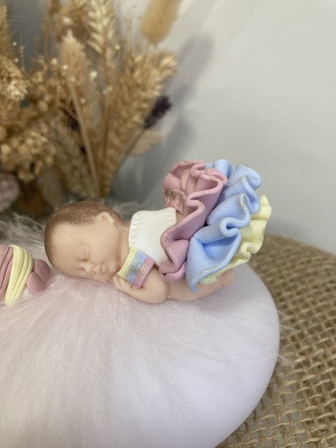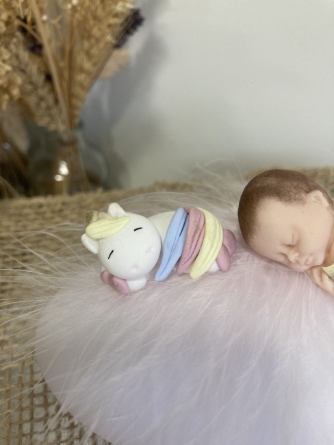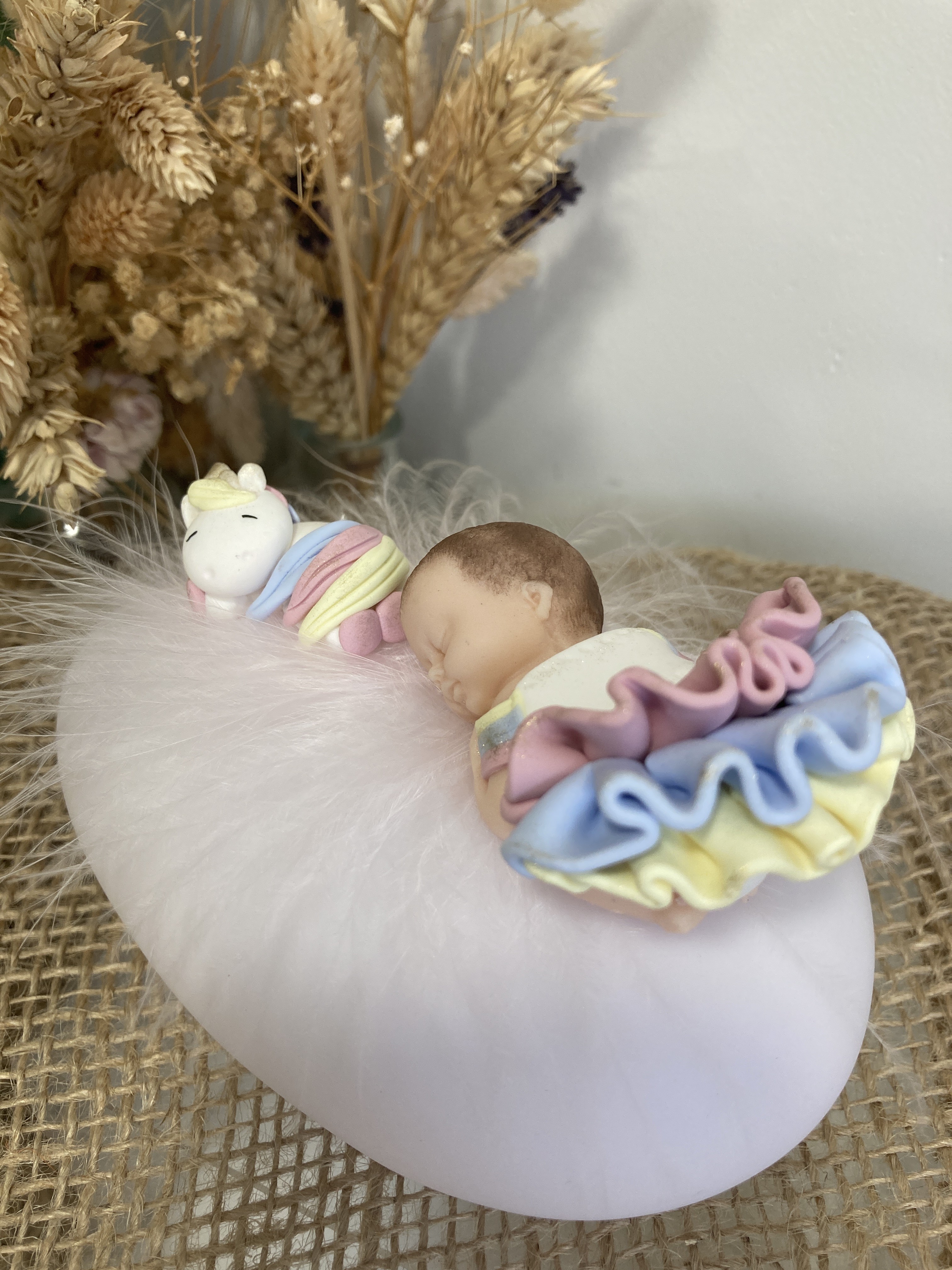 Modelée à la main avec soin, cette adorable scène met en valeur un bébé endormi auprès de sa licorne magique, sur un doux coussin duveteux aux tons pastel.