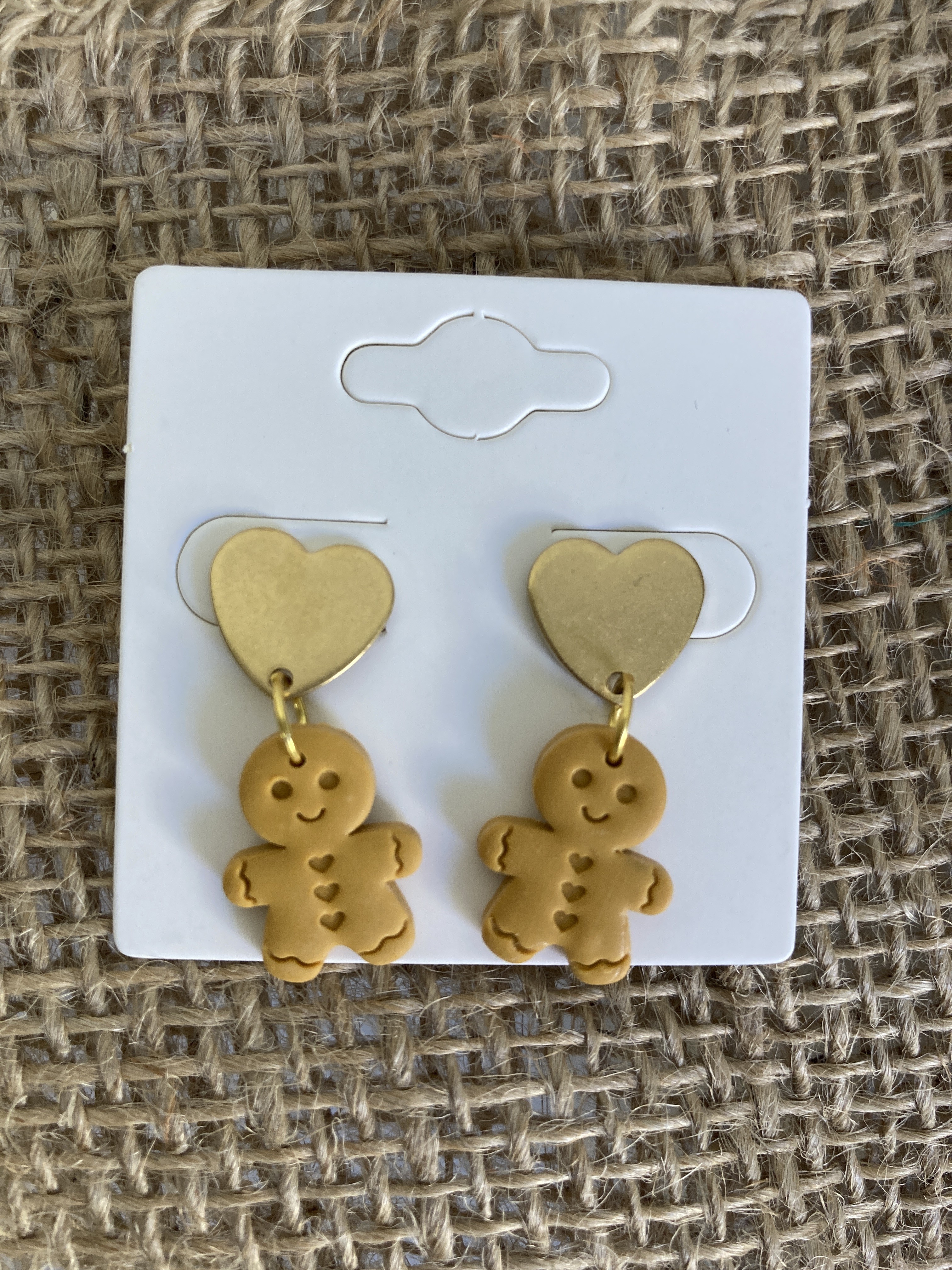 Laissez-vous séduire par ces adorables boucles d’oreilles en forme de petits bonshommes pain d’épices, suspendus à un joli cœur doré.