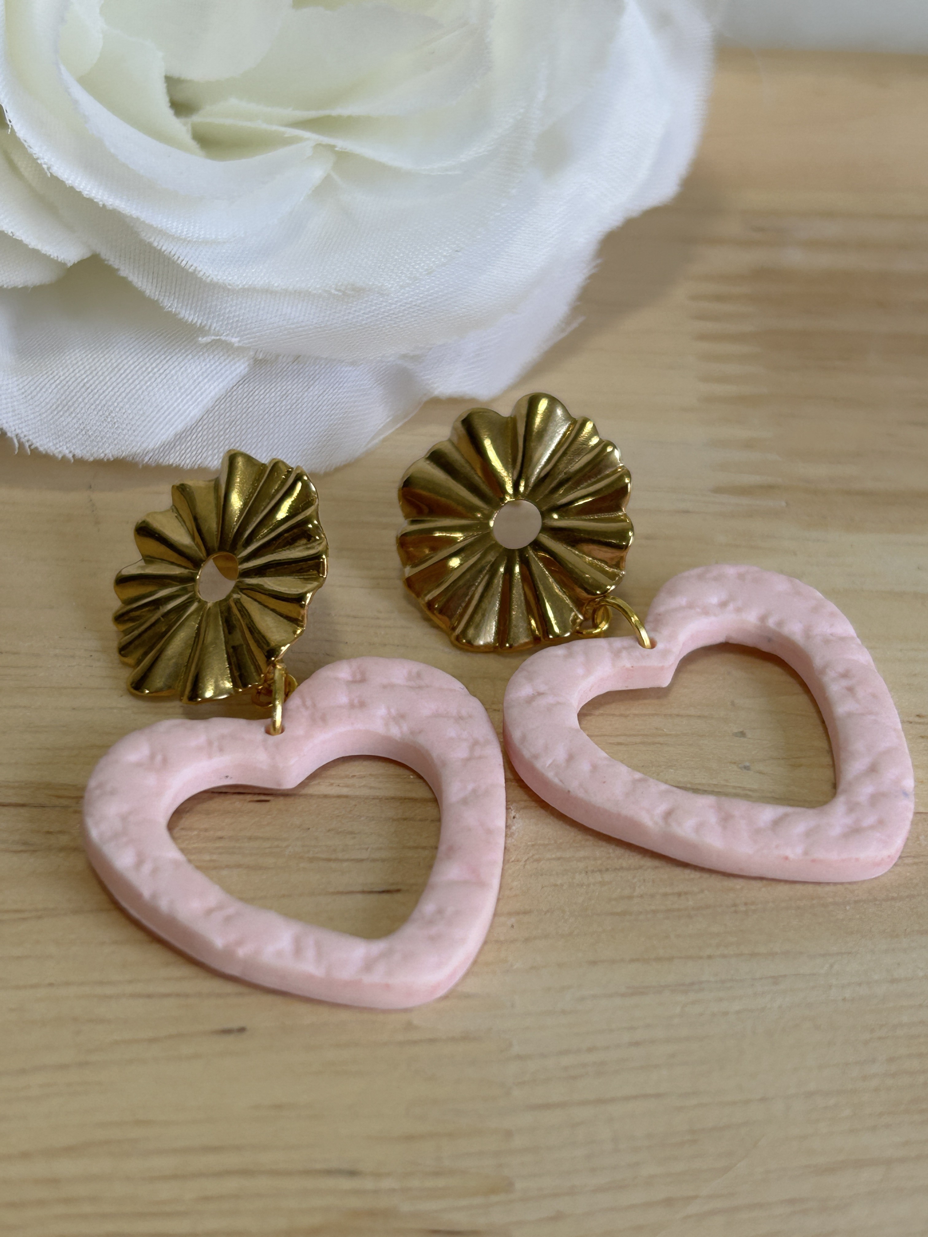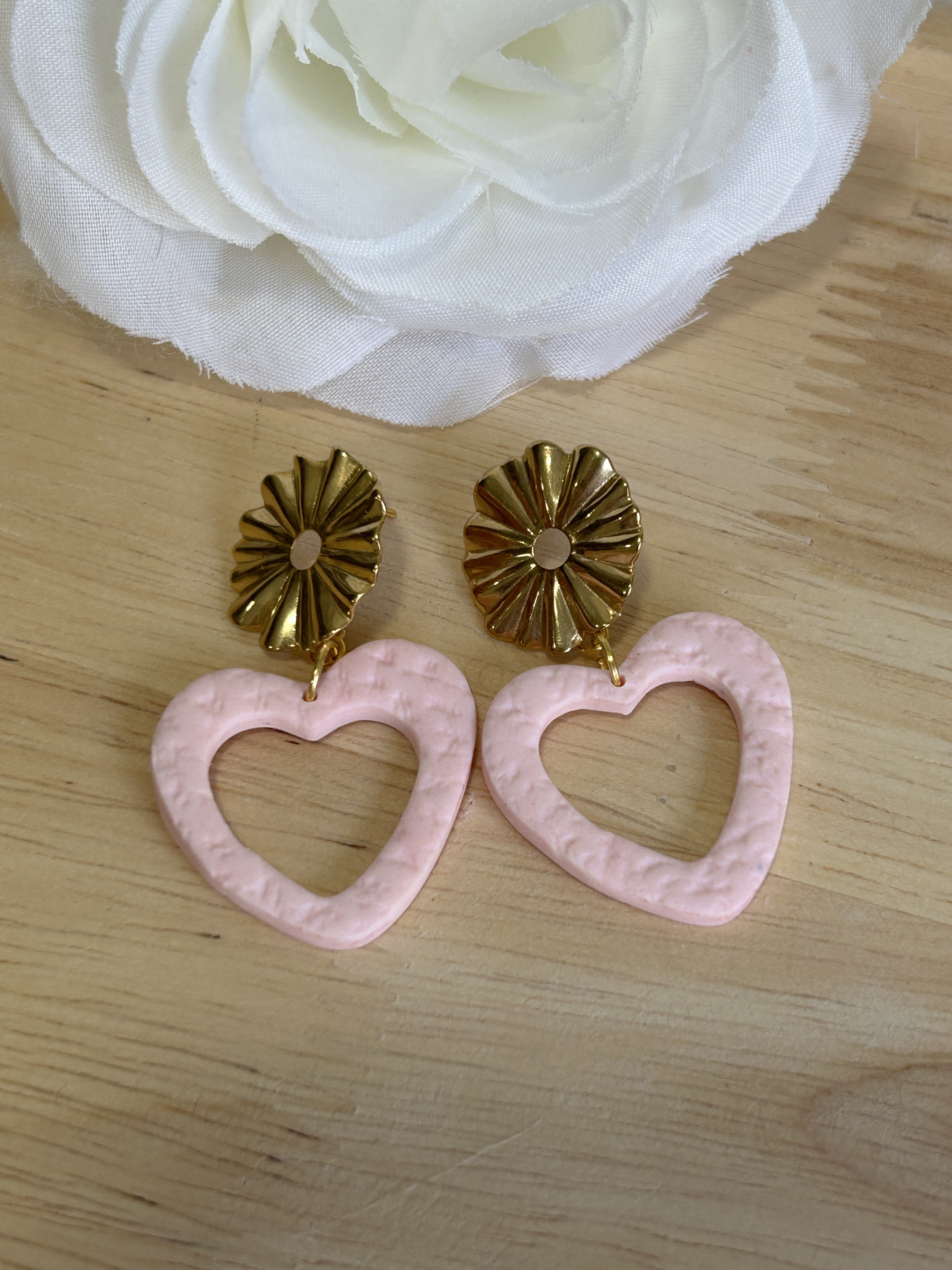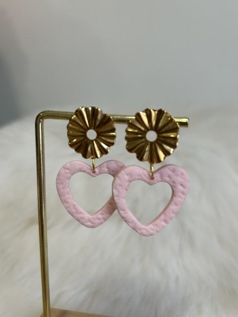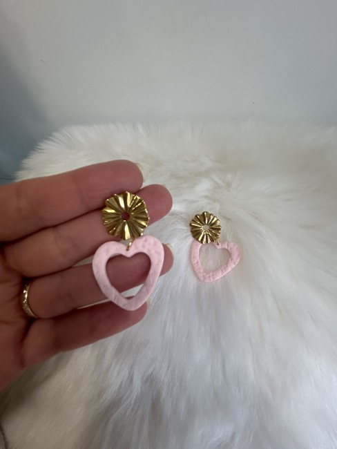 Elles associent un cœur rose poudré texturé, façonné à la main, à une attache dorée en forme de fleur soleil, pour un bijou à la fois romantique, lumineux et délicatement vintage.