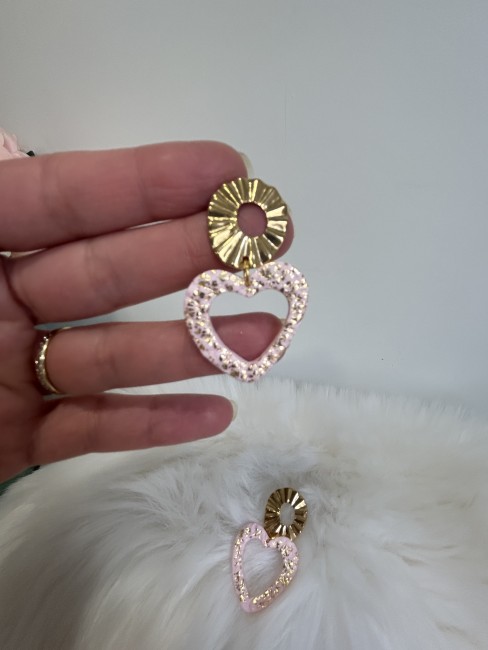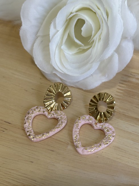 Leur cœur rose poudré, subtilement parsemé de feuilles d’or, est façonné à la main pour offrir une texture unique et pleine de charme. Il est suspendu à une attache dorée effet soleil, apportant éclat et élégance à l’ensemble.