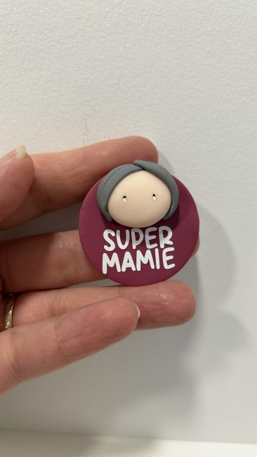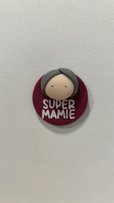 Réalisé avec soin, ce magnet rond met en scène un visage délicatement modelé, sur un fond bordeaux chaleureux. Son inscription "SUPER MAMIE" apporte une note affectueuse et valorisante, parfaite pour célébrer toutes les mamies extraordinaires.