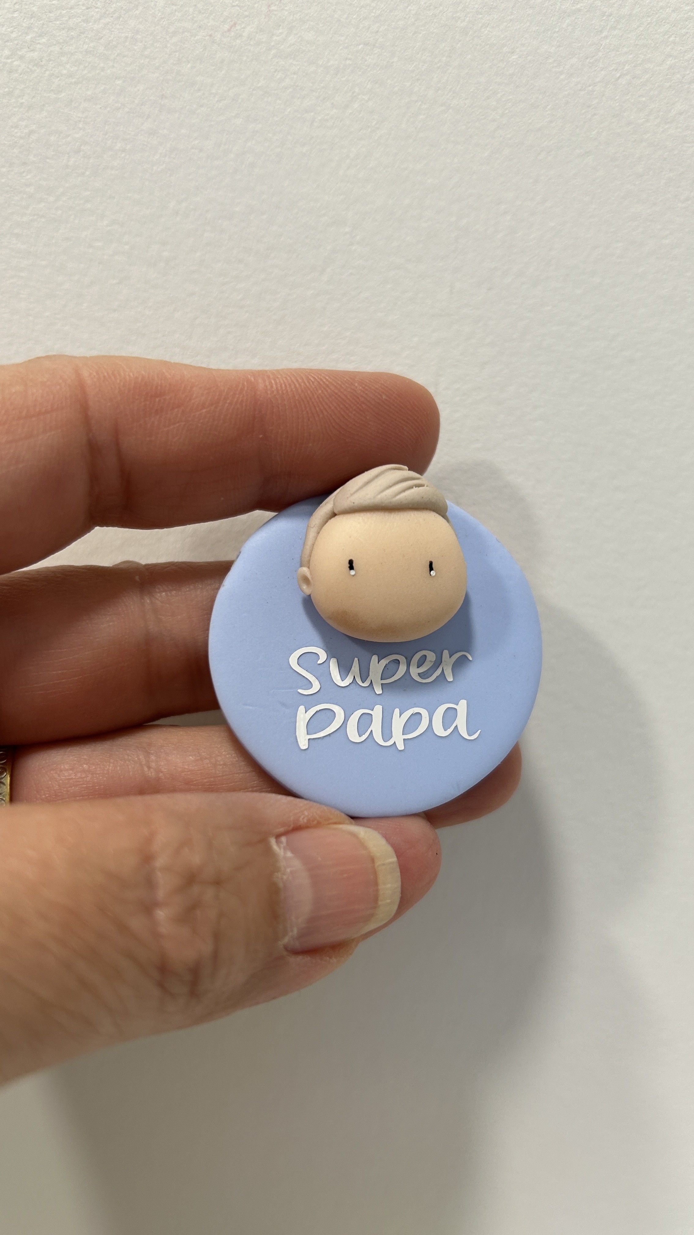 Réalisé avec soin, ce magnet rond met en scène un visage délicatement modelé, sur un fond bleu chaleureux. Son inscription "SUPER PAPA" apporte une note affectueuse et valorisante, parfaite pour célébrer tous les papas extraordinaires.