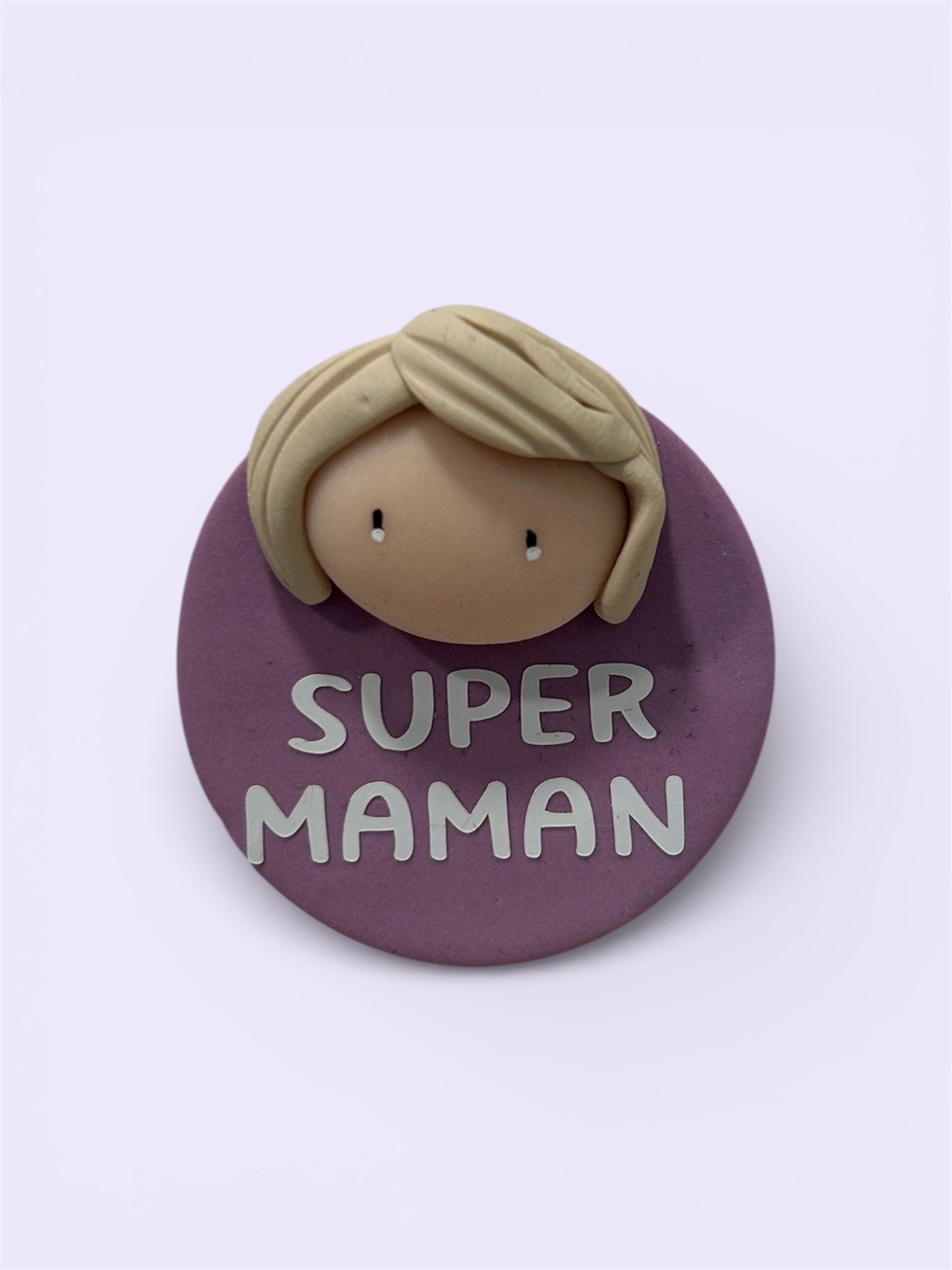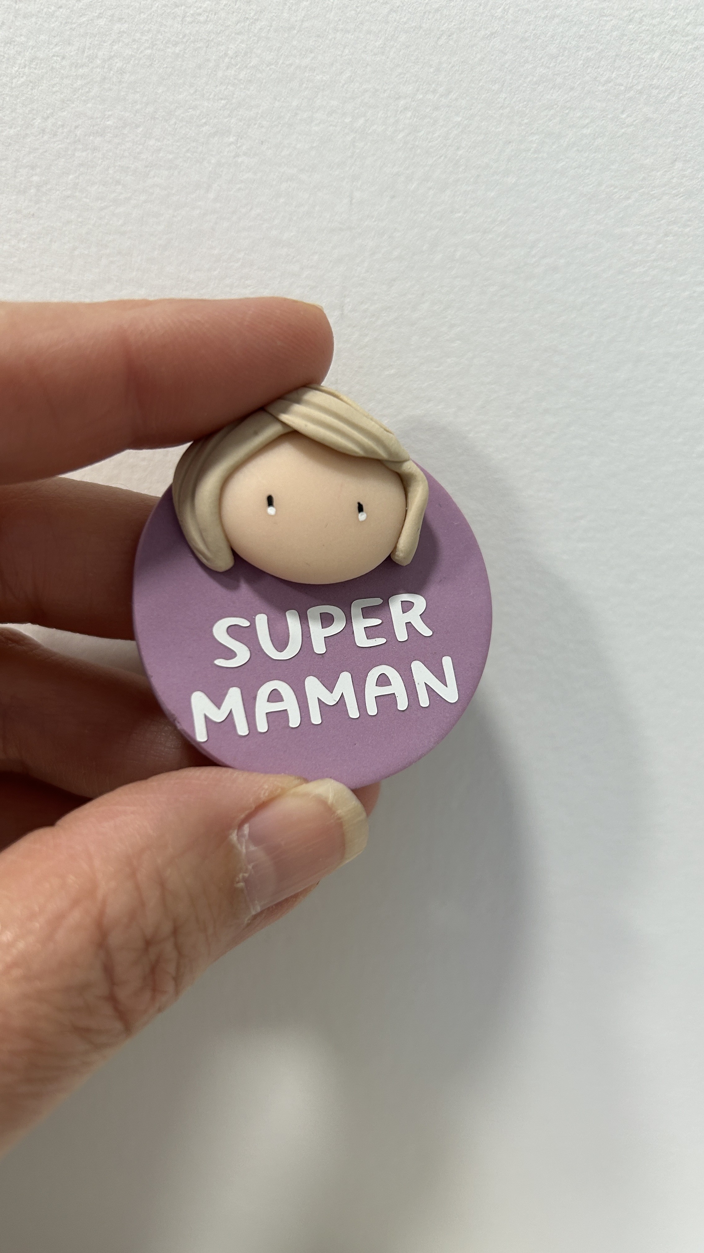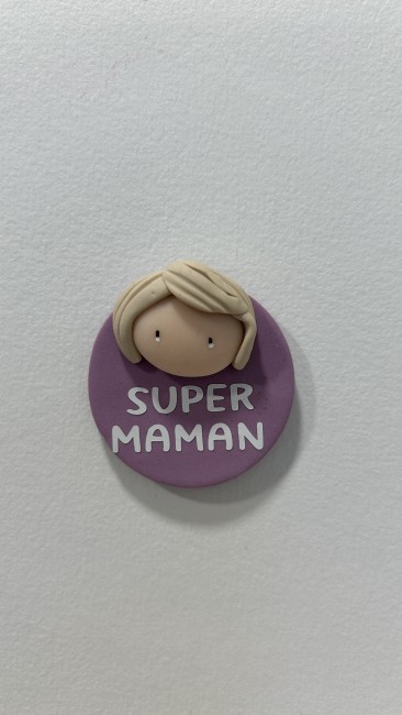 Réalisé avec soin, ce magnet rond met en scène un visage délicatement modelé, sur un fond bordeaux chaleureux. Son inscription "SUPER MAMAN" apporte une note affectueuse et valorisante, parfaite pour célébrer toutes les mamans extraordinaires.
