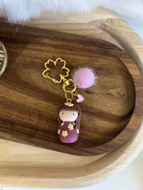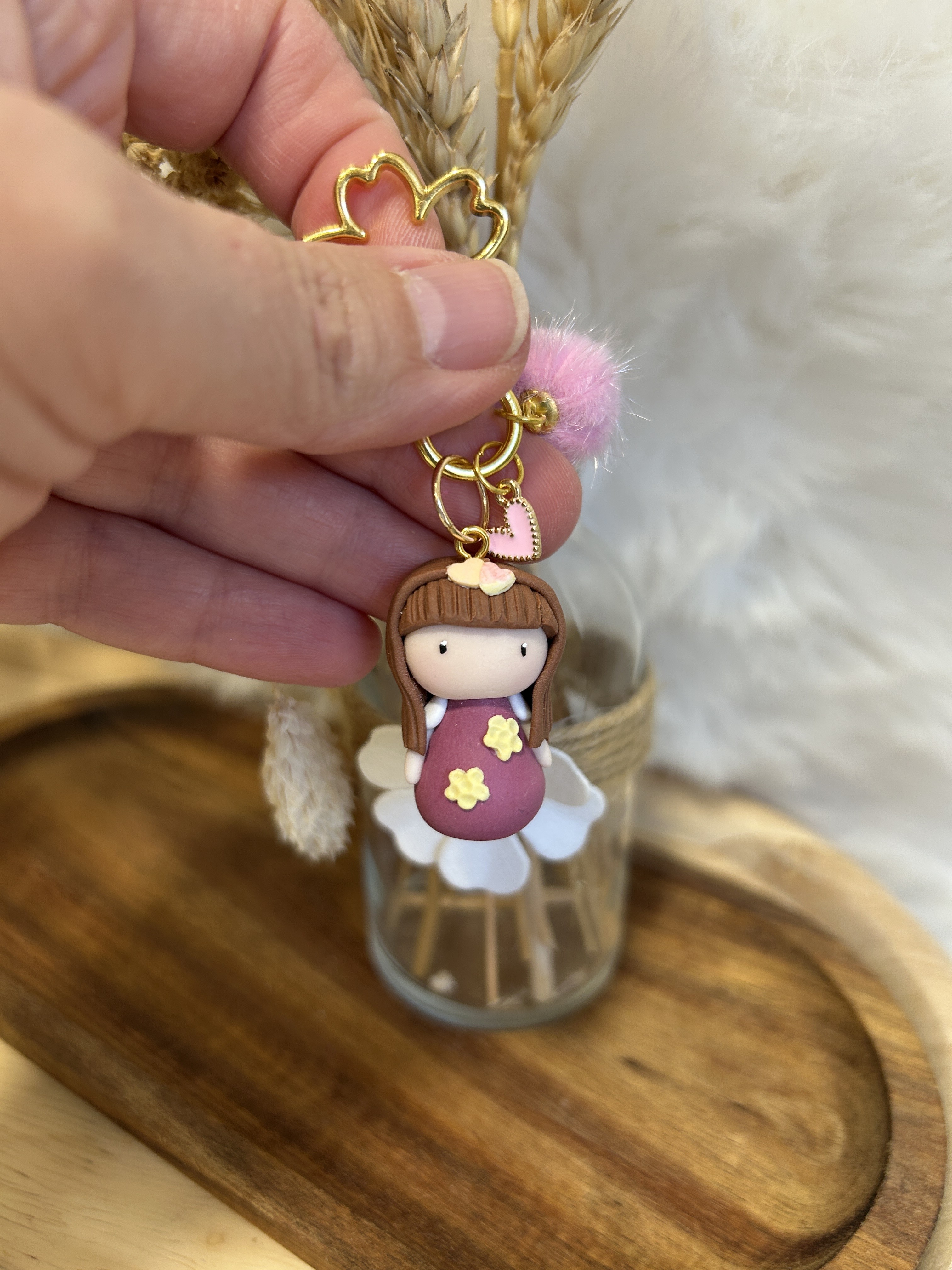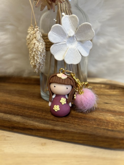 Cette adorable petite poupée, entièrement modelée à la main en pâte polymère, porte une robe couleur prune délicatement décorée de petites fleurs jaunes. Son univers tendre et poétique est sublimé par un mousqueton doré en forme de fleur, un pompon rose tout doux et une petite breloque cœur pour une touche encore plus romantique.